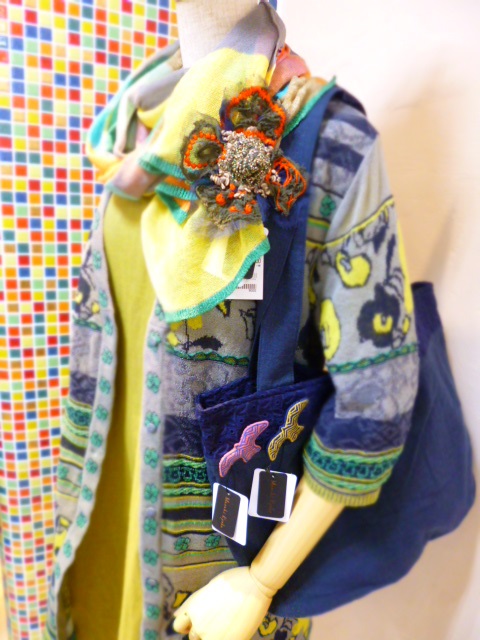 こちらの春らしいコーディネートのアクセントとなっている、バッグと鳥さんのコサージュをご紹介します。