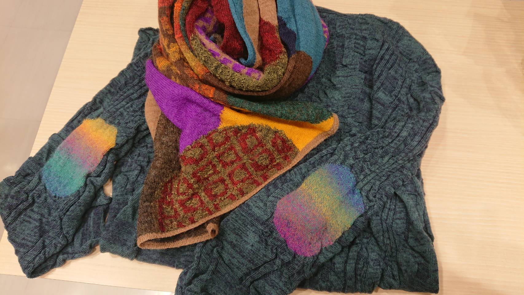 ニットの肘あてと ストールの配色がばっちり共存して