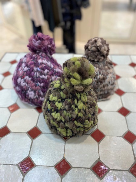 左 プルオーバー¥28600ニットワンピース¥33000パンツ¥29700帽子¥15400ブローチ各¥3850
