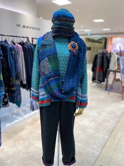 右 プルオーバー¥31900パンツ¥42900ストール¥16500帽子¥11000コサージュ¥7700 (すべて税込み)