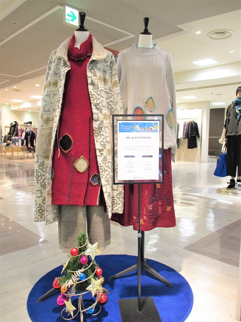 只今、4階上りエスカレーター前ではM.&KYOKOのお洋服もX`masバージョンでお出迎え中です。
