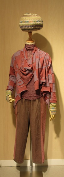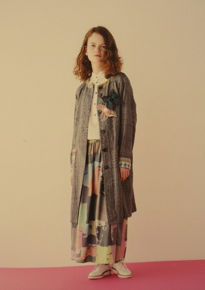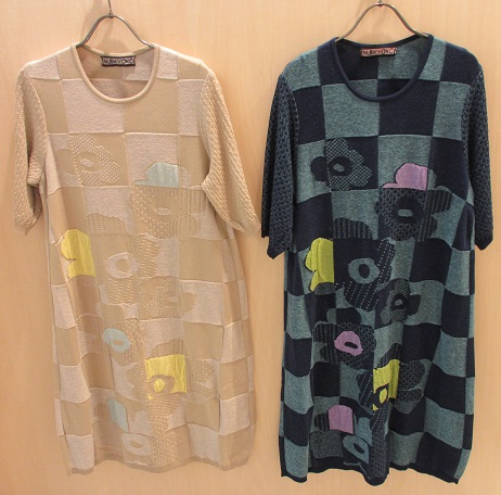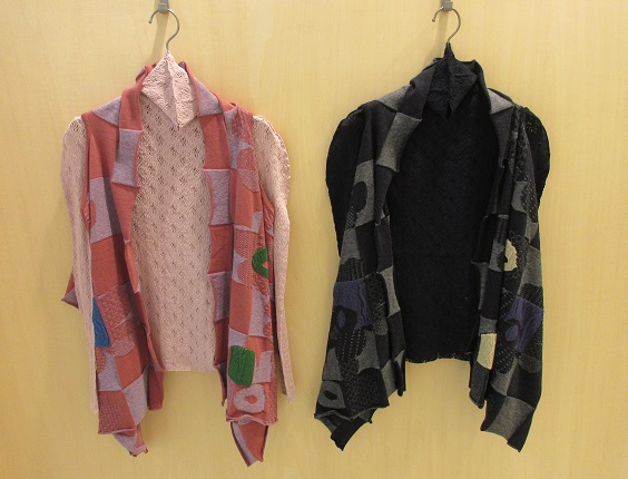 着丈がアシンメトリーのショート丈カーディガンは楽しいテキスタイルです。