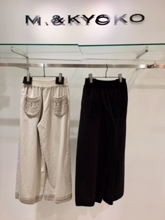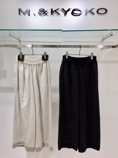 こちらのワイドパンツはローゲージを後ろのポケットと裾のところに施しております。