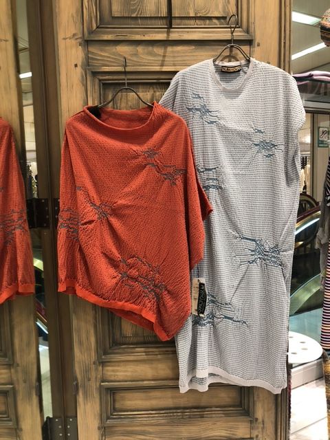 左:シャリ感ある和紙×ポリエステルのシリーズの変形プルオーバーとワンピース