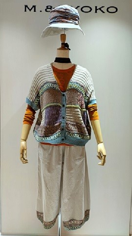 やわらかなベージュのコーディネートに、ブルーとオレンジのアクセントカラーがポイント。