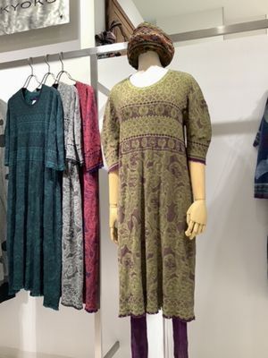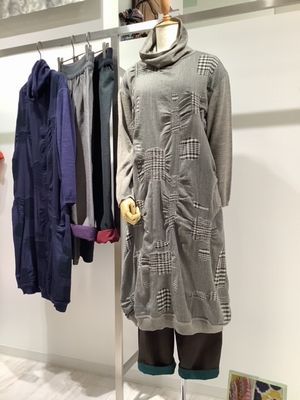 右側 先ほどのコートと同じテキスタイルのワンピースは軽くてすっきりしたラインがポイントです。レギンスと合わせても素敵です。ワンピース¥53.900 、パンツ¥31.900税込み価格