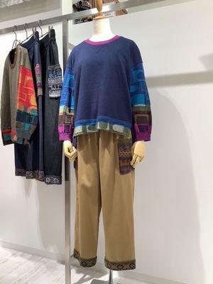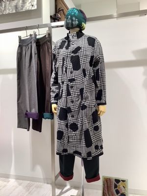左側 ふくらみのあるウールとガーゼ調の極細コットンで表情があるテキスタイルがお洒落です。コート¥71.500 パンツはリバーシブルで2本分の着こなしが楽しめます。¥31.900税込み価格