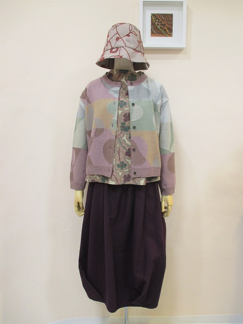 幾何学柄は合わせるアイテムや色合いで可愛らしくもクールな感じにも着回せるので毎回好評の柄です。