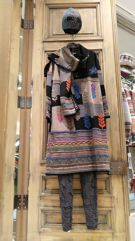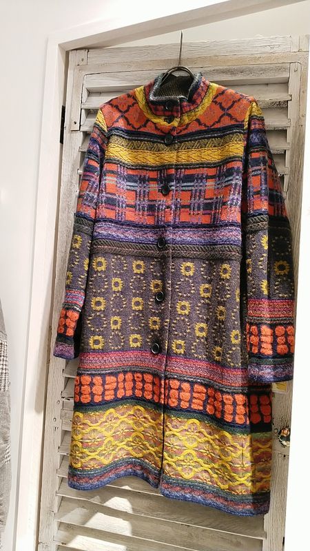 細かい編み柄と配色が美しいM.&KYOKOの定番ジャガードニットコートです。