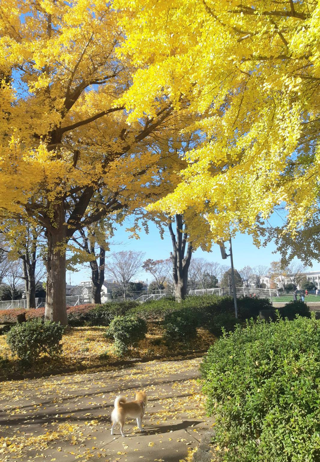 みごとな銀杏の紅葉を犬と散歩